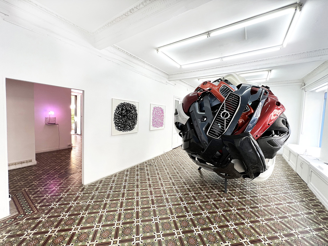 Mais l’exposition est aussi et surtout un conglomérat de véritables pièces détachées. Bump It Up est ainsi une grande sculpture sphérique (250 cm de diamètre), composée de morceaux de pare-chocs récupérés dans une casse automobile puis assemblés autour d’un noyau en bois. Réalisé pour la première fois en septembre 2023, en pleine nature lors de la résidence Mi Project en Corse, l’objet impressionne par sa présence ambivalente, entre légèreté et massivité, plein et vide, artefact étrange issu à la fois du monde romanesque et visuel de Crash de J.G. Ballard puis de David Cronenberg, et des compositions baroques des peintures-objets de Franck Stella. Installée au centre de la galerie Espace à vendre (première salle) qui donne sur la rue Assalit (avec sa façade peinte en bleu de méthylène), Bump It Up est entourée de deux photos-peintures, là aussi au motif très sphérique, telles des cibles hypnotiques et flottantes aux couleurs bleutées. Récentes, ces œuvres intitulées Vicious Circle sont produites à partir de photos de paysages dont les lignes de pixels ont été étirées. On en trouve une troisième dans le château, la grande salle du fond de la galerie après la cour intérieure, installée comme un œil/regard qui vient ponctuer le parcours. Cet espace est en grande partie quadrillé par des cordes tendues entre les murs, un peu comme l’avait fait Marcel Duchamp en 1942 à New York lors d’une exposition dédiée au Surréalisme, et dont il était le scénographe. Pour Duchamp, il s’agissait à l’époque de déstabiliser la vue des visiteurs et des visiteuses, de « changer d’optique ».